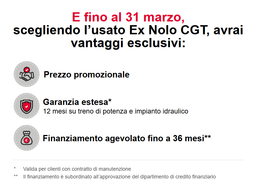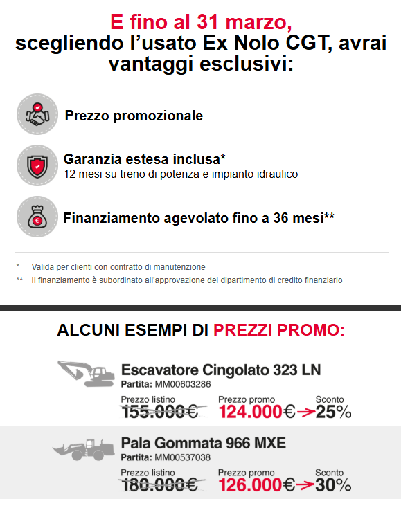 Proprio come un grande vino, l’usato proveniente dalla flotta noleggio CGT è di Origine Controllata e Garantita. Ne conosciamo la storia, ce ne prendiamo cura ogni giorno e possiamo garantirne la qualità. La nostra flotta è la più moderna e tecnologicamente avanzata sul mercato perché la rinnoviamo continuamente. Per questo, oggi puoi scegliere tra oltre 100 macchine Ex Nolo: pale ed escavatori, sia gommati sia cingolati, dumper articolati, trattori cingolati, finitrici e frese, tutti Caterpillar, ma anche prodotti Komptech e Sandvik.