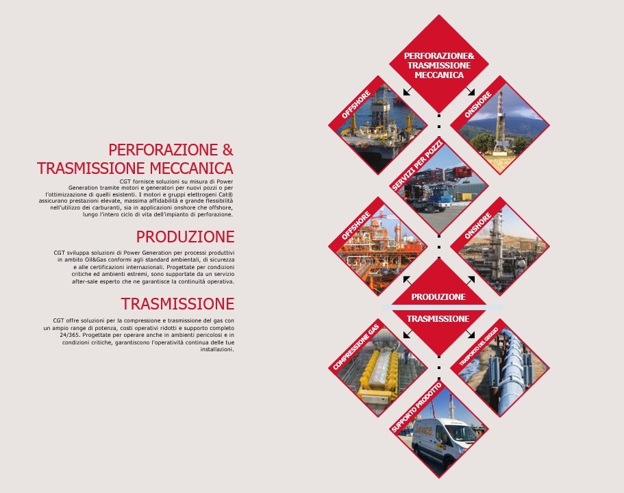 L’energia è essenziale per estrarre, lavorare e trasportare prodotti petroliferi, soprattutto in aree remote e difficilmente accessibili. CGT è il tuo partner di riferimento, in grado di offrire soluzioni personalizzate per tutte le applicazioni upstream, midstream e downstream, dal pompaggio alla compressione, fino a qualsiasi esigenza di alimentazione ausiliaria, principale o di emergenza. Combinando l’elevata qualità dei motori Cat®, un range di potenza da 100 kW a 6.000 kW e soluzioni ingegnerizzate su misura, CGT mette a tua disposizione competenze e strumenti per supportarti lungo tutte le fasi del progetto: dall’analisi pre-contrattuale fino alla messa in servizio e all’avviamento dell’impianto ed alla sua manutenzione, garantendo continuità operativa e affidabilità nel tempo.