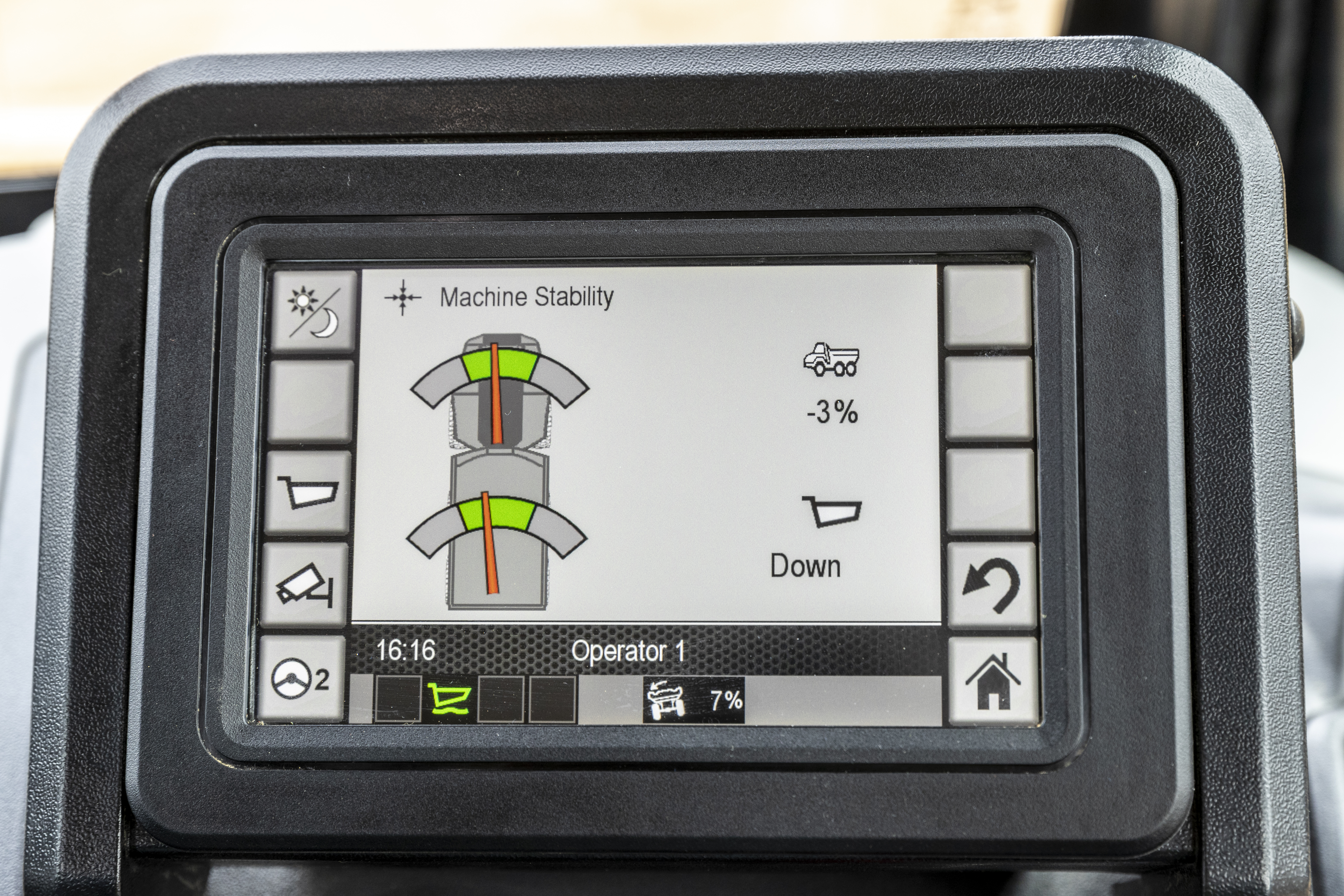 "Il sistema Cat Detect con la funzione Stability Assist avverte l'operatore quando la macchina si sta avvicinando a un angolo non sicuro durante la guida o il ribaltamento del cassone. Se si utilizza il sollevamento assistito, la macchina interrompe il sollevamento del cassone ed emette un avviso sia acustico che visivo. Il sistema monitora gli angoli della cabina, del telaio posteriore e la pendenza longitudinale in modo indipendente."