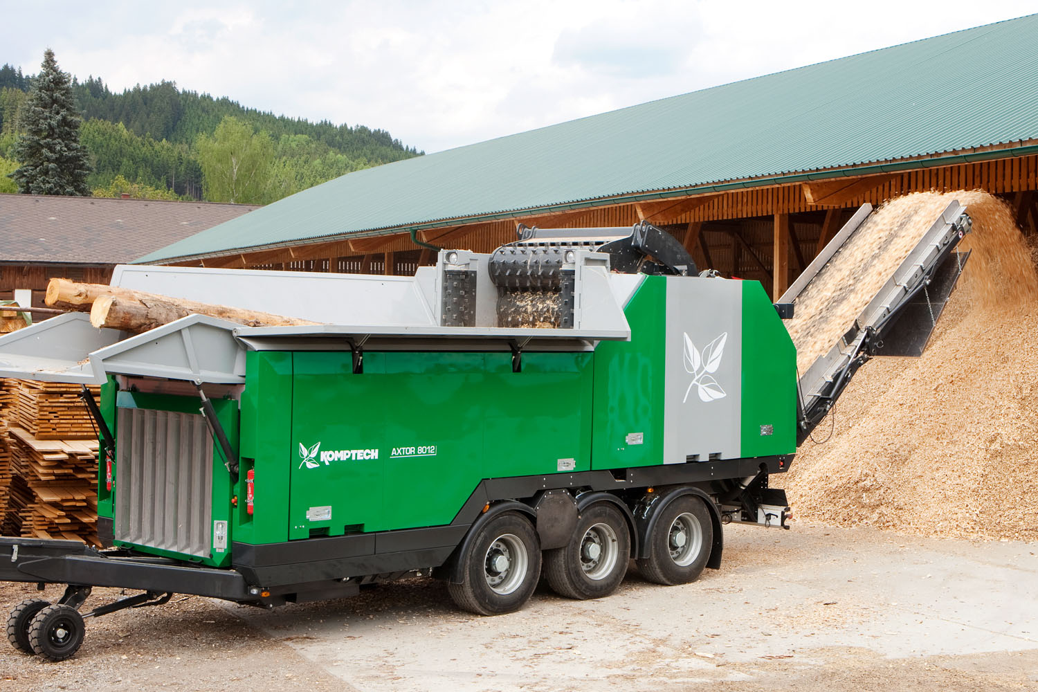 Grandi soluzioni per l’Axtor 8012: i rulli di alimentazione orizzontale e verticale e l’ampio nastro in acciaio assicurano un trasporto sicuro del materiale all’interno della macchina, sia che siano grandi tronchi, che materiali sfusi come ramaglie. La bocca di alimentazione ampia, ( 1,6 x 1 m) assicura sempre una alimentazione costante senza inceppamenti.