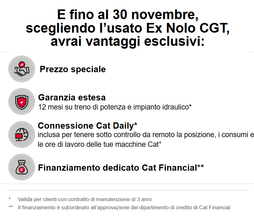 Proprio come un grande vino, l’usato proveniente dalla flotta noleggio CGT è di Origine Controllata e Garantita. Ne conosciamo la storia, ce ne prendiamo cura ogni giorno e possiamo garantirne la qualità. La nostra flotta è la più moderna e tecnologicamente avanzata sul mercato perché la rinnoviamo continuamente. Per questo, oggi puoi scegliere tra oltre 70 macchine Ex Nolo: pale ed escavatori, sia gommati sia cingolati, dumper articolati, trattori cingolati, finitrici e frese, tutti Caterpillar, ma anche prodotti Komptech e Sandvik.