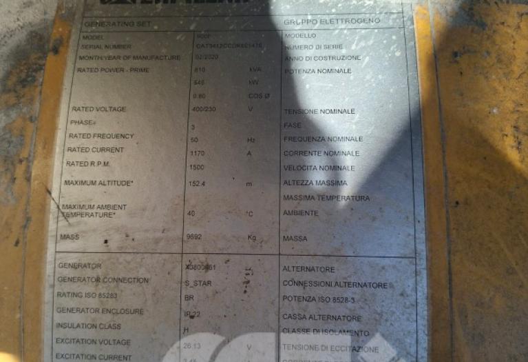 • Versione Macchina prime • Tipo di Alimentazione gasolio • Frequenza di lavoro 50 hz • Cofanatura cofanatura per insonorizzazione • Serbatoio standard a basamento • Quadro di controllo motore digitale • Quadro elettrico di potenza/scambio di rete gruppo • Gruppo prese/spine kW 708 kVA 810 - kW 648 kVA 900 - kW 720 • Marcatura CE • Certificato CE • Libretto Uso e Manutenzione